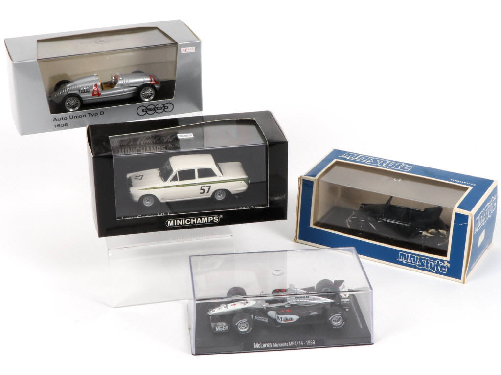 on y retrouve les modèles : COX 1937 CAB, MC LAREN MERCEDES MP4, LOTUS CORTINA MK I & AUTO UNION TYP D des marques MINI STYLE, ALTAYA, MINICHAMPS & BRUMM - quelques accrocs sur les boites