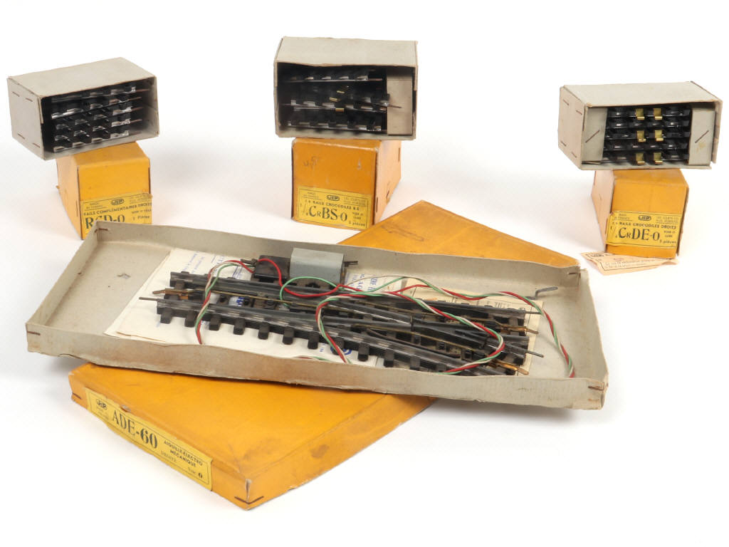 traverses en plastique - on y retrouve 2 boîtes de 1/4 de rails crocodiles, une boîte de rails complémentaires & une aiguille électromécanique (non testé avec documentation) - ensemble plus ou moins encrassé - possibilité de petits manques