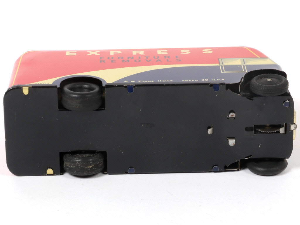 longueur : 15 cm - avec moteur à clef (fonctionne) & porte de fourgon ouvrante - quelques petites rayures sur la carrosserie par endroits (notamment sur l'avant de celle-ci)