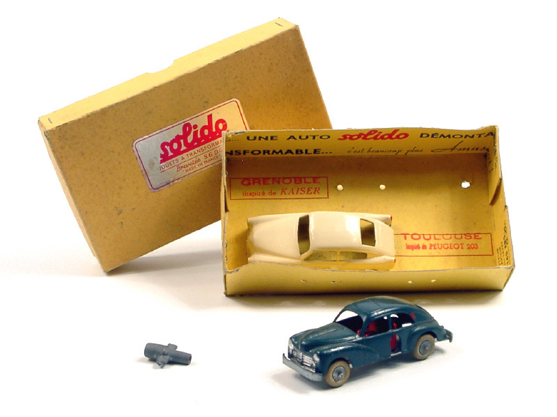 contient : une GRENOBLE inspirée de KAISER , une TOULOUSE inspirée de PEUGEOT 203, un châssis, 2 axes avec roues & pneus, une banquette, une lamelle de châssis & une clef de démontage