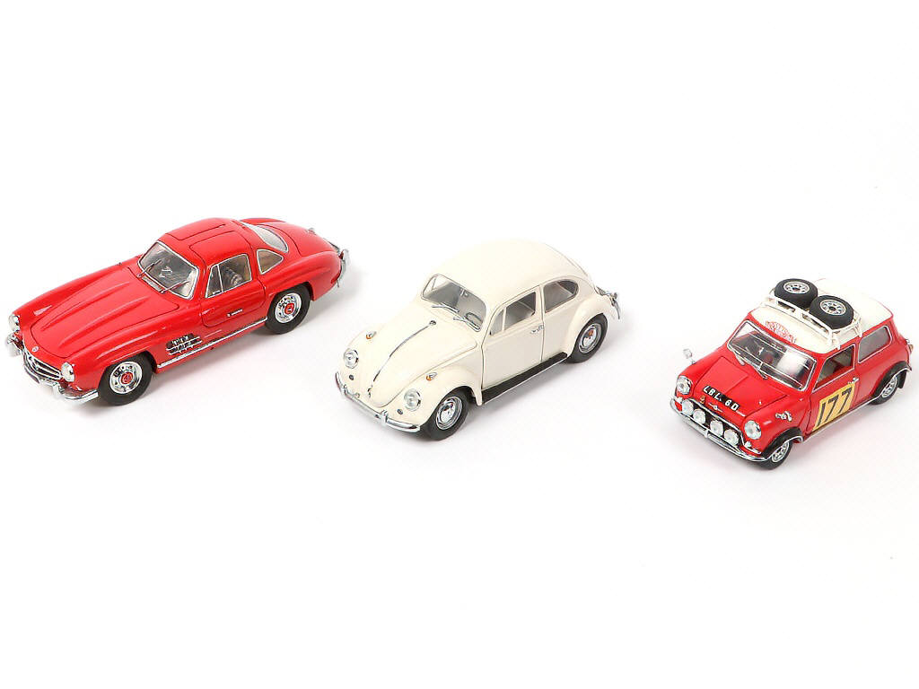 échelle 1/24ème - comprend les modèles : MERCEDES-BENZ 300 SL, VOLKSWAGEN COCCINELLE (1967) & MORRIS MINI COOPER S (1967), édition RALLYE - avec emballages d'origine non représentés sur les photos (cales en polystyrène & carton) - possibilité de petits manques & parties cassées