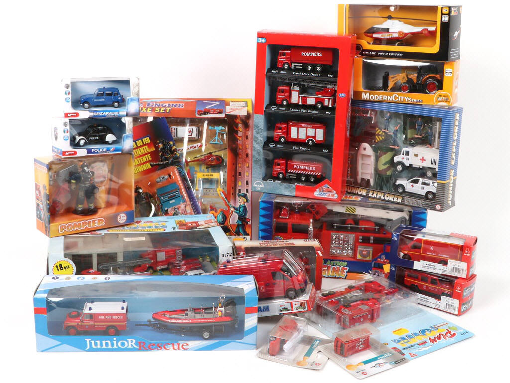 différentes échelles - comprend notamment les modèles : coffret pompier 18 pièces, coffret JUNIOR EXPLORER 'HONGWELL' & coffret FIRE ENGINE - boîtes & blisters en états 'a' à 'c'