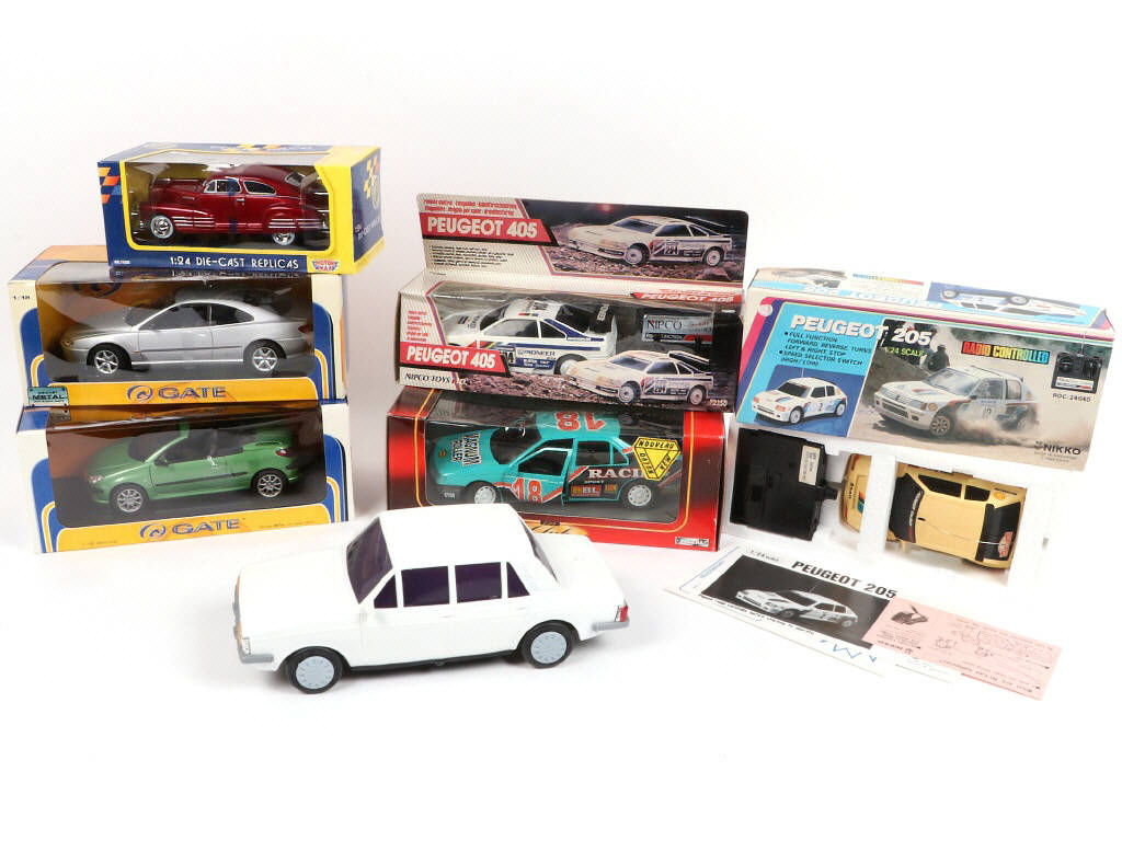 différentes échelle 1/18ème & 1/24ème - comprend notamment les marques : MAJORETTE, MOTOR MAX & NIKKO - on y retrouve les modèles : PEUGEOT 205 (Radio Commandé - non testé), PEUGEOT 206CC & PAYKAN SPORT (Made in IRAN) - boîtes en états 'b' à 'c'