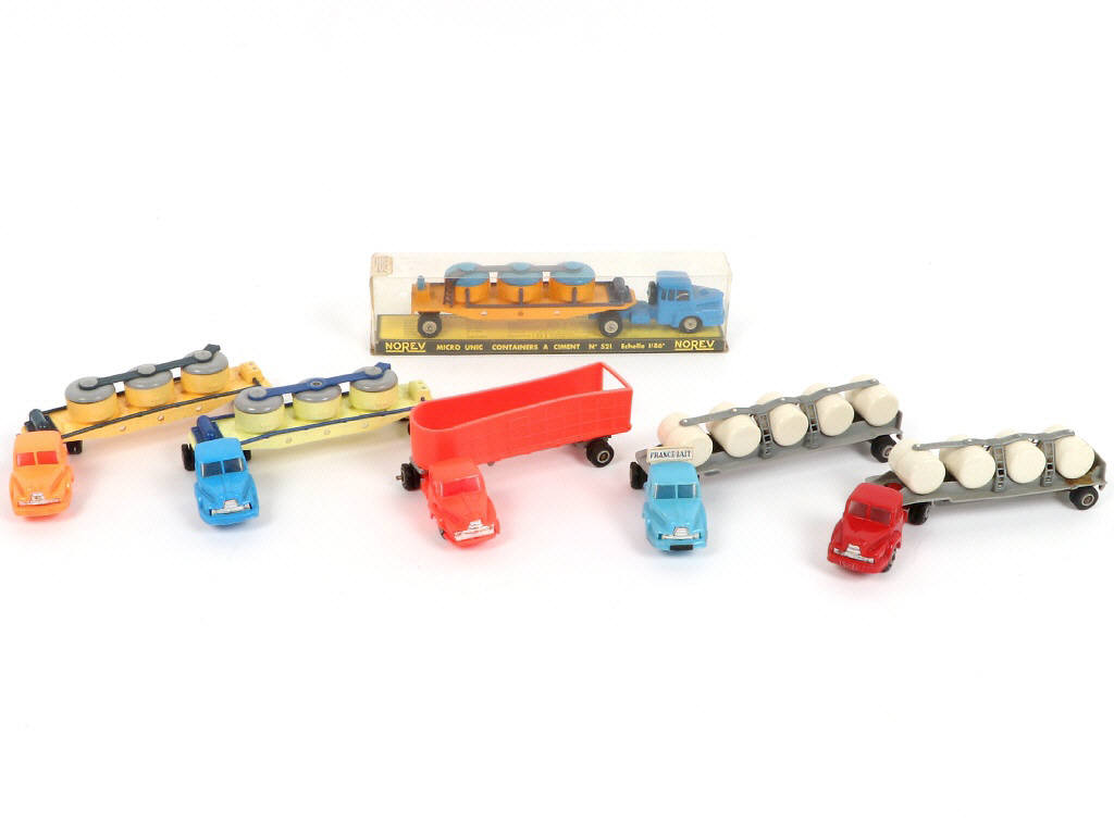 série MICRO - comprend notamment les modèles : UNIC CONTAINERS A CIMENT N°521, UNIC 'FRANCE LAIT' & UNIC REMORQUE TITAN - un exemplaire en boite (état 'b') - avec manques & parties cassées