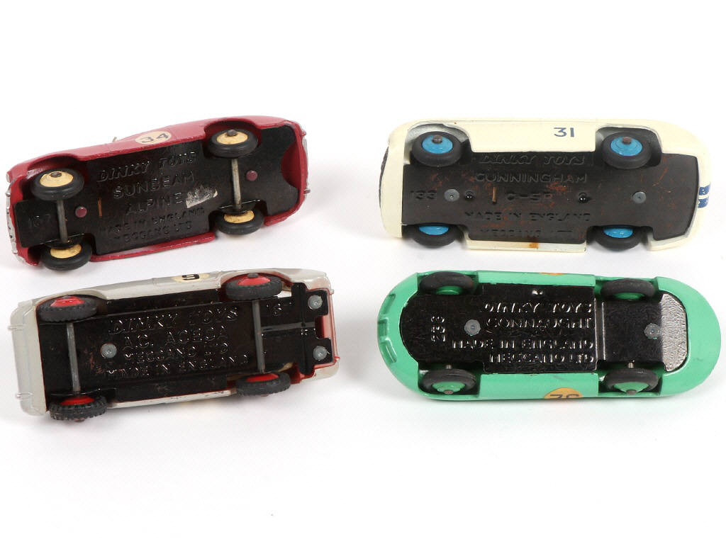comprend : CONNAUGHT, A.C. ACECA (décalques ajoutés), SUNBEAM ALPINE (retouches) & CUNNINGHAM - quelques légères traces d'humidité & d'oxydation - ensemble légèrement encrassé - pneus plus ou moins séchés & déformés