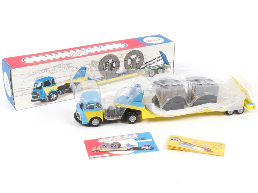 C.I.J./NOREV (FRANCE) 4/75/00 SOMUA Semi-remorque surbaissée porte-bobines de câbles bleu, jaune & noir