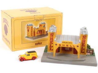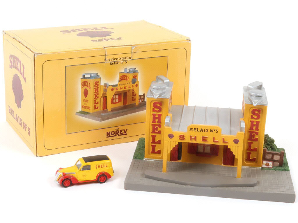 dimensions : 25,5 x 18 x 14 cm - fabrication en résine - accrocs sur la boîte - on y joint un véhicule 'SHELL' de la marque CORGI (kiosque) - un rétroviseur cassé & manquant