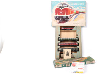 comprend notamment : un coffret 'MARKLIN' avec motrice & voitures de voyageurs (incomplet & non testé), une gare 'HORNBY' (semble complet avec notice) & un transformateur 'MARKLIN' (non testé) - possibilité de petits manques & parties cassées - boîtes en état 'b' à 'c'