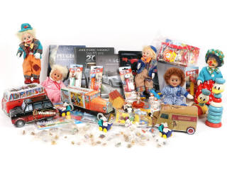 le lot comprend notamment : clowns, livres de voitures, pin's, véhicules en tôles (boîtes à buiscuits) & PEZ