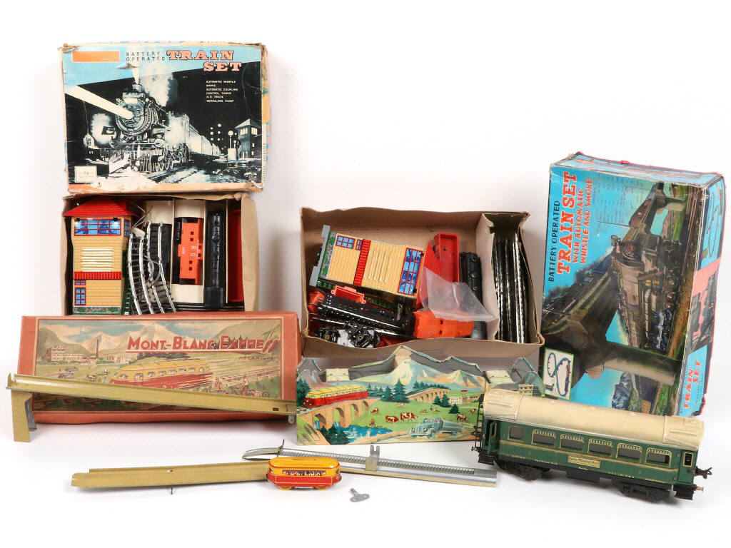 comprend notamment : MONT-BLANC-EXPRESS (complet avec clef), voiture de voyageur 'KARL BUB' (sans système électrique - marchepieds repeints) & 2 coffrets TRAIN SET (semblent complets non testés) - boîtes en état 'b' à 'c' - quelques manques & parties cassées