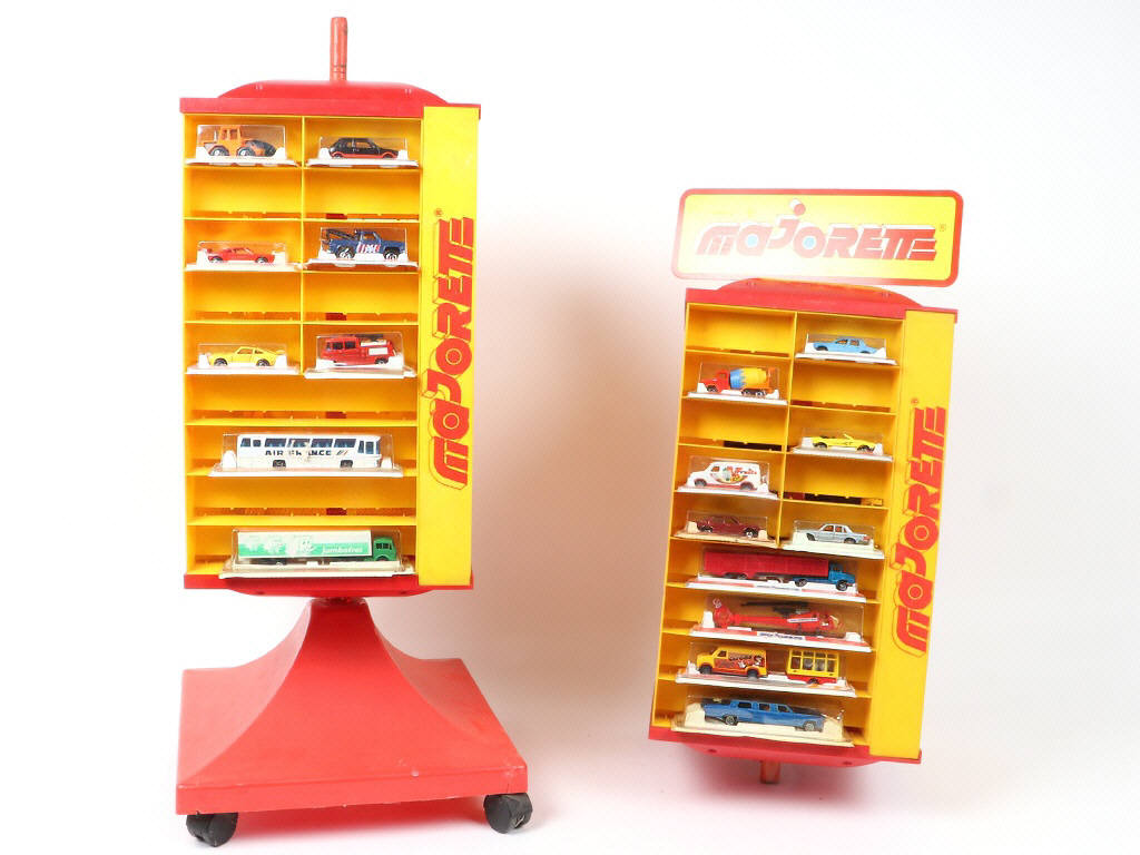comprend : un présentoir MAJORETTE double (démonté pour la photo) - dimensions : socle 35 X 35 cm, casiers de rangement : 28 X 28 x 157 cm (fixation de la pancarte MAJORETTE cassée & petit manque d'un cm2 sur un côté d'un casier) - on y retrouve les séries : 200 & 300 ainsi que les modèles : PEUGEOT 205 GTI N°281, MUSTANG GT N°227, OLDSMOBILE N°255 & CADILLAC LIMOUSINE N°339 - SHOWBOX en état 'b' à 'd' - A VENIR RECUPERER SUR PLACE DE PREFERENCE (SURCOUT DE FRAIS DE LIVRAISON A PREVOIR POUR UNE EXPEDITION)