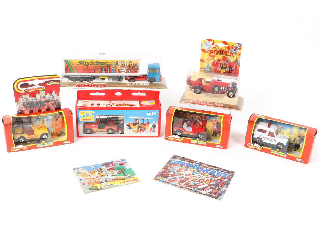 comprend notamment les modèles : semi-remorque 'BILLY'S BAND' série 3000 & MAJOCAR 'POLICE, FIRE DEPT & tavaux' - on y joint 2 petits catalogues 'MAJORETTE & MAJOKIT' - boîtes en état 'b' à 'c'