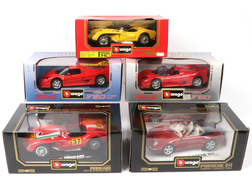 échelle 1/18ème - comprend notamment les modèles : FERRARI 250 TESTA ROSSA (1957) & PORSCHE 911 CARRERA CABRIOLET (1994) - boîtes en état 'a' à 'b'
