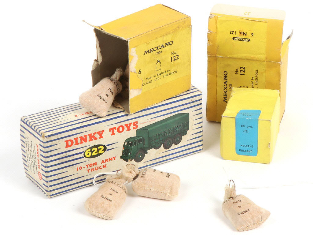 comprend les références : 122 (2 exemplaires, 14 sacs, plus ou moins jaunis & tachés), 096 (12 pneus non séchés) & 622 - les boîtes sont en état 'b à 'e')