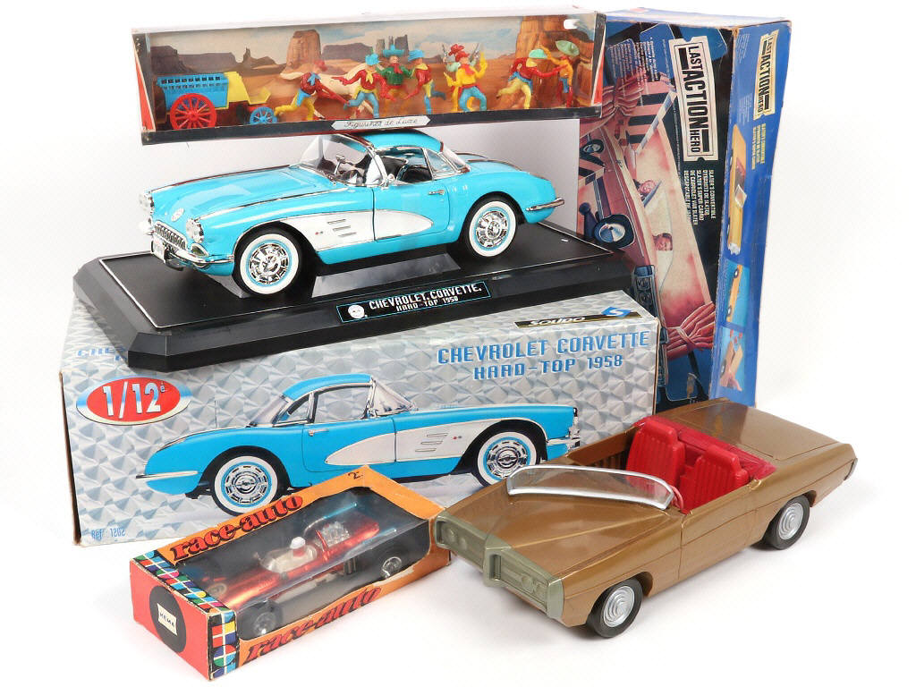 grandes échelles - on y retrouve notamment les marques : MATTEL & SOLIDO - quelques petites parties cassées & manquantes - les boîtes sont en état 'c' - on y joint un coffret de figurines en plastique de la marque JEM