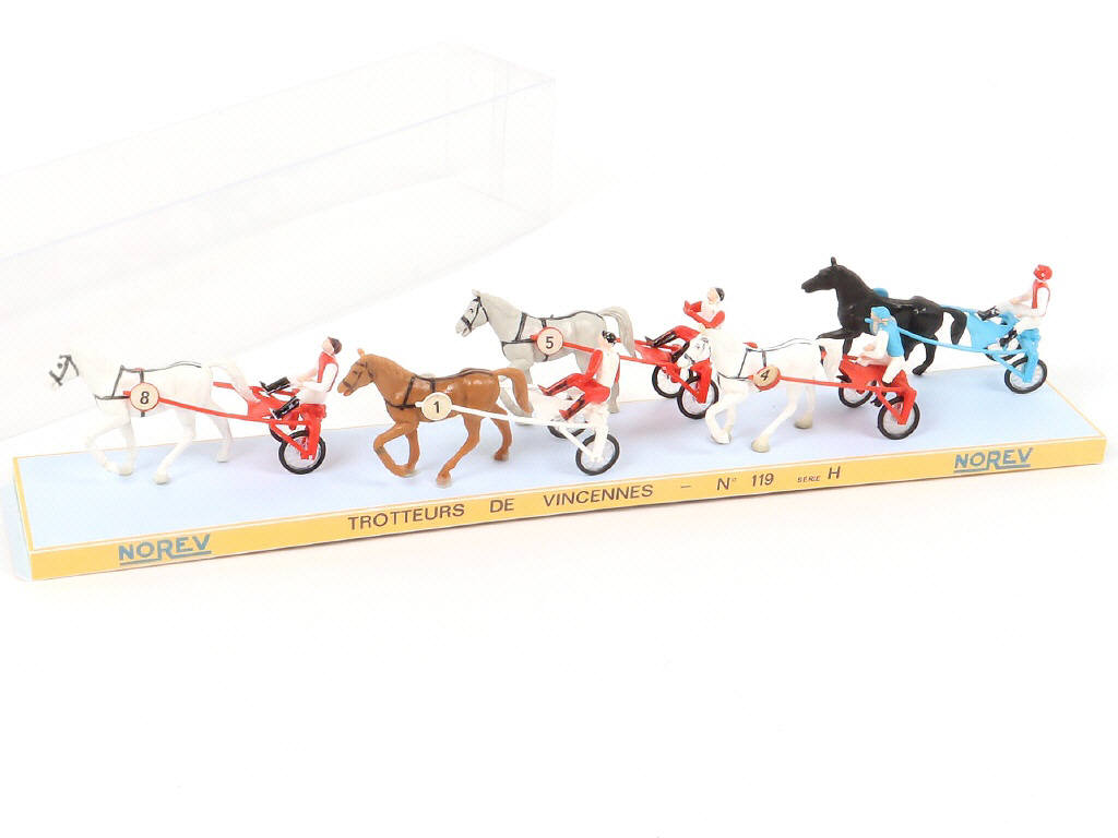 NOREV (FRANCE) 119 Ensemble de 4 sulkys du coffret 'TROTTEURS DE VINCENNES' bleu, blanc, rouge, marron & noir