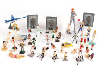 réalisation en résine - dimensions : de 6 à 22 cm - on y joint 4 stylos publicitaire & une petite boîte métallique - petits manques & parties cassées