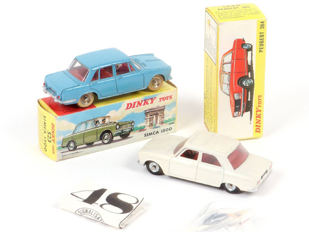 comprend SIMCA 1500 (pneus non conformes & séchés) & PEUGEOT 304 (suspension arrière affaissée) - bagages manquants - rabats légèrement décolorés