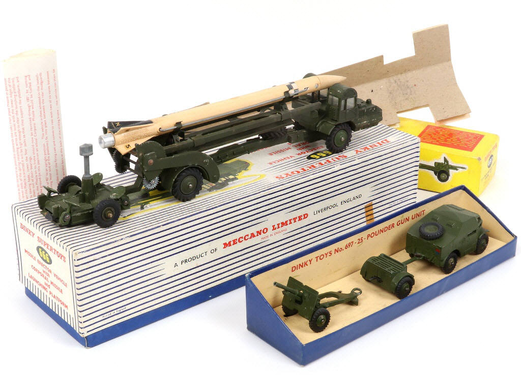 quelques traces d'humidité plus ou moins importantes sur le modèle & la boîte (avec notice & cales dont une endommagée) - missile jauni avec nez séché - on y joint un 25 pounder field gun set de la marque en état 'C.c' (avec cale)