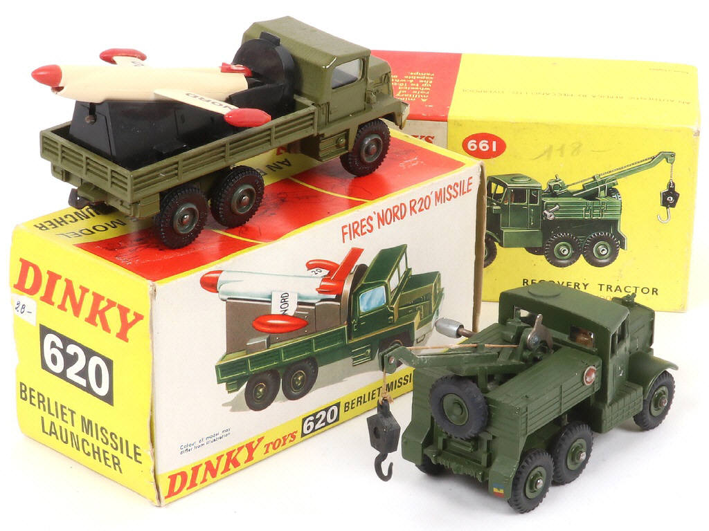 avec missile (incomplet, système de lancement fonctionne) - sans cale - boîte plus ou moins déformée - on y joint un RECOVERY TRACTOR de la marque en état 'A.b' (petites traces d'oxydation sur le modèle & la boîte, avec cale)