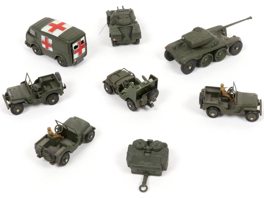 DINKY TOYS (FRANCE) Ensemble de 7 véhicules militaires & une cuisine roulante kaki