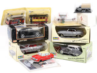 échelle 1/18ème pour les modèles des marques : MAISTO & REVELL - la BORGWARD en tôle a un moteur à clef fonctionnel - on y joint 4 véhicules supplémentaires & une devanture de garage