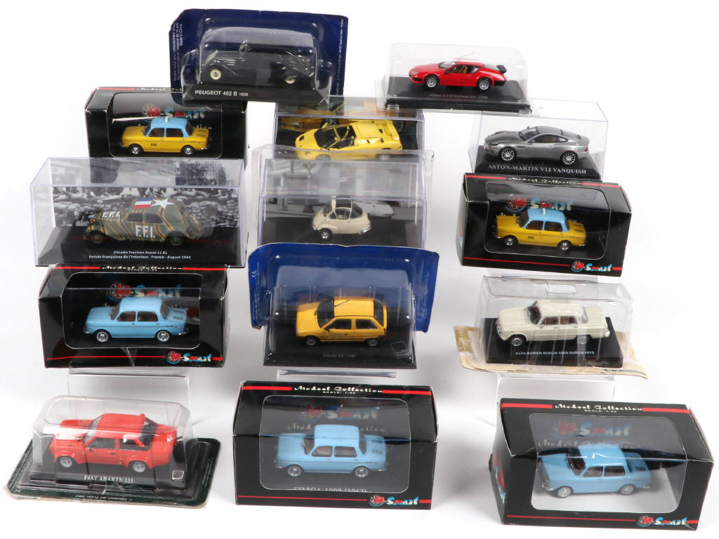 comprend notamment les modèles : SIMCA 1000, ASTON MARTIN V12 & FIAT ABARTH - possibilité de petits manques & parties cassées - boîtes en état 'a' à 'b'