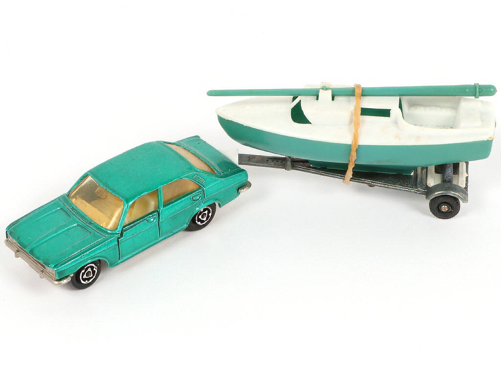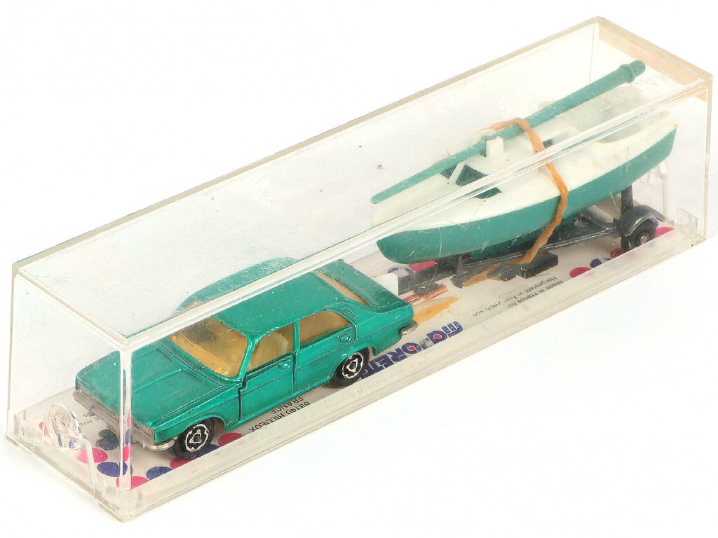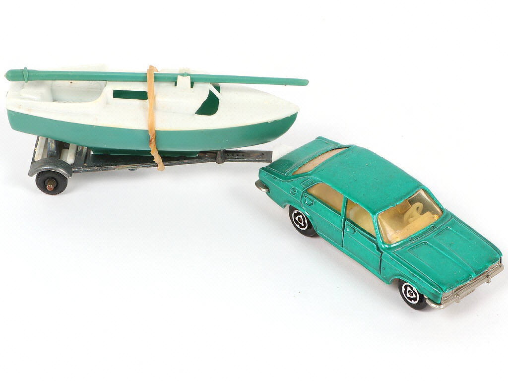 MAJORETTE (FRANCE) 338 CRYSLER 180 & voilier sur remorque vert, bateau blanc & vert