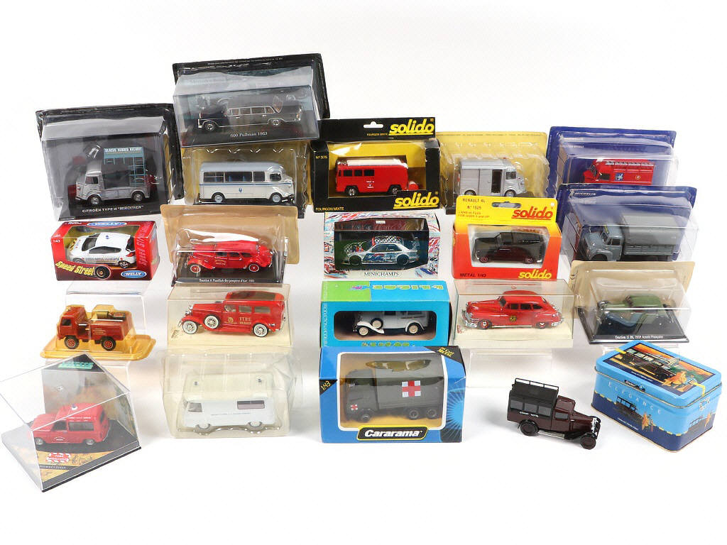 comprend notamment les marques : CARARAMA, VITESSE, SOLIDO & MINICHAMPS - boîtes en état 'a' à 'c' - possibilité infime de petits manques & parties cassées