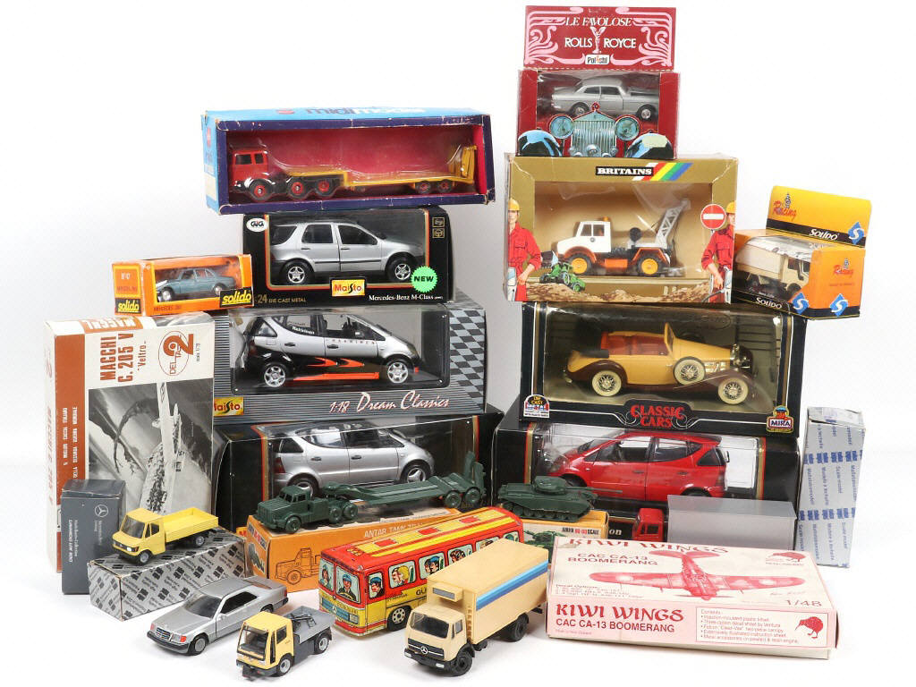on y retrouve notamment les marques : MAISTO, AIRFIX & BRITAINS - avec quelques petits manques & parties cassées sur certains exemplaires - les kits à monter semblent complets - les boîtes présentées sont en état 'b' & 'c' (certains exemplaires sans boîte)