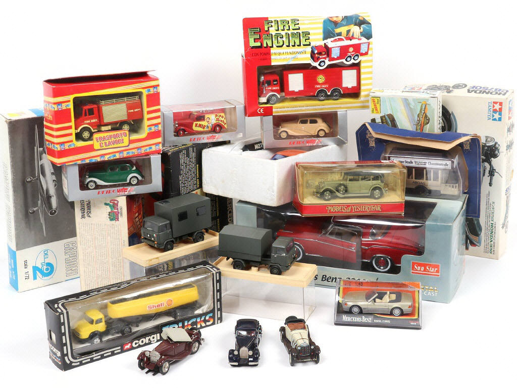 on y retrouve notamment les marques : ABC, CORGI TOYS & SUNSTAR - quelques petits manques & parties cassées sur certains exemplaires - les boîtes présentées sont en état 'b' & 'c' (certains exemplaires sans boîte) - 3 modèles à monter semblent complets