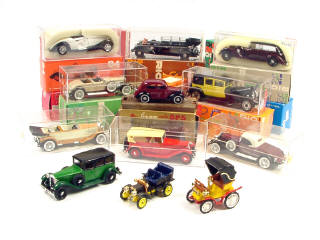 miniatures reproduisant les modèles : MERCEDES, LANCIA, ROLLS ROYCE, BUGATTI, DUESENBERG, FIAT, DECAUVILLE & HISPANO SUIZA - 2 boîtes en état 'c' - un modèle de la marque BRUMM & un autre de la marque SAFIR - quelques petites pièces à refixer