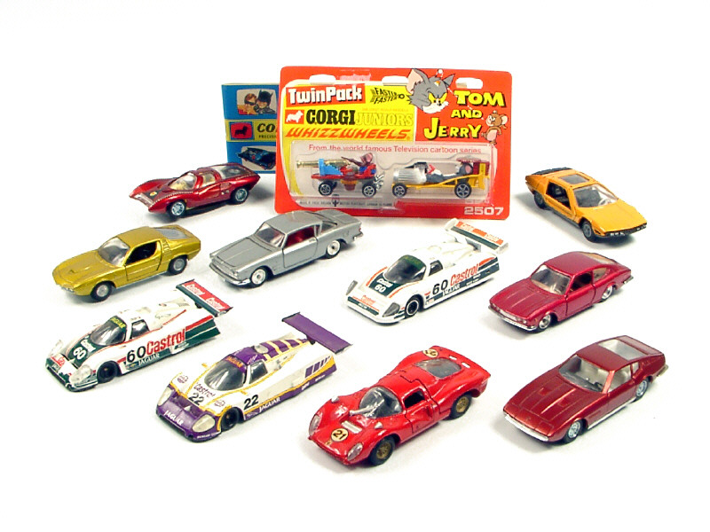 états de 'A' à 'C' - miniatures reproduisant les modèles : JAGUAR, ALFA ROMEO, LAMBORGHINI, MASERATI, FIAT & FERRARI - une partie de portière cassée - un plancher en métal fatigue - on y retrouve les marques : EDIL TOYS, ONYX, PILEN, CORGI TOYS & MERCURY - on y joint 2 véhicules du dessin animé 'TOM & JERRY' de la marque CORGI JUNIOR sous blister jamais déballé & un catalogue de 1966 de la marque CORGI TOYS