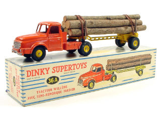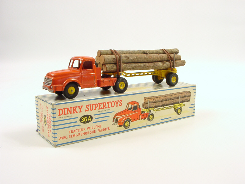 DINKY TOYS (FRANCE) 36A WILLEME Fardier (version avec jantes convexes & remorque ajourée) orange & jaune
