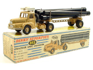 DINKY TOYS (FRANCE) 893 UNIC Saharien transport de pipe-lines (version avec jantes concaves & remorque ajourée) sable & blanc
