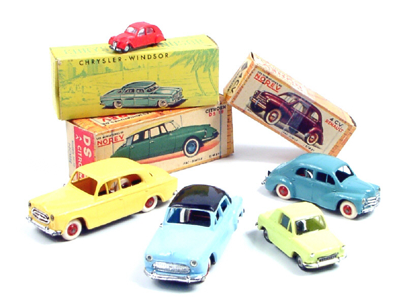 comprend : une RENAULT FREGATE GRAND PAVOIS (manque antenne), une PEUGEOT 403 (manque antenne & jantes fondues), une RENAULT 4CV (manque antenne & plaque minéralogique arrière), une VESPA 400 & une CITROËN 2CV (série micro-miniature en état 'F') - les boîtes sont en état 'c' dont une de la marque CIJ