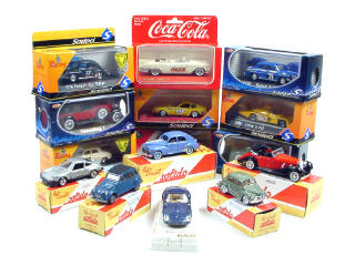 miniatures reproduisant les modèles : RENAULT, PEUGEOT, CITROËN, FERRARI, DUESENBERG, ALPINE, PORSCHE, BUGATTI, CADILLAC & MERCEDES - on y retrouve la publicité COCA COLA - un modèle en état 'B' - 4 boîtes en état 'c'