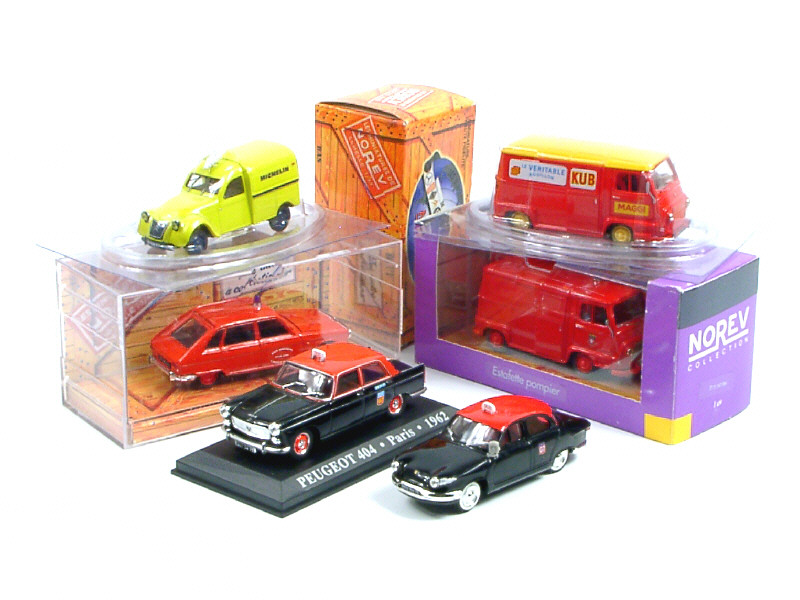 comprend : une RENAULT ESTAFETTE pompiers, une RENAULT ESTAFETTE 'KUB', une CITROËN 2CV fourgonnette 'MICHELIN', une RENAULT R16 de pompiers, une PANHARD PL17 TAXI G7 & une PEUGEOT 404 TAXI G7 - 2 modèles sous bulle-plastique - une boîte en état 'c' - un modèle de la marque ALTAYA