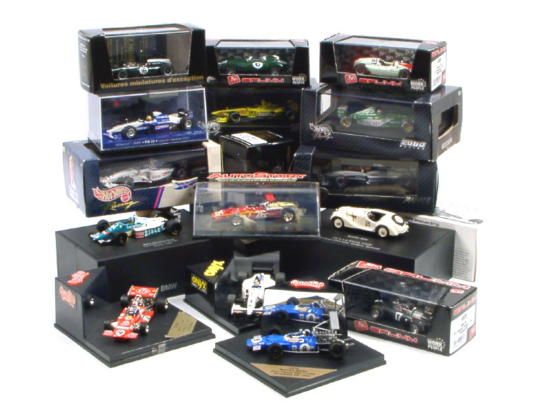 miniatures reproduisant les modèles : TYRRELL, MARCH, MATRA, COOPER, B.R.M., WILLIAMS, JORDAN, JAGUAR, FERRARI, BMW-BRABHAM & FORD - on y retrouve les marques : BMW-CLASSIC COLLECTION, QUARTZO, ONYX, BRUMM, HOT WHEELS & AUTOSTORY