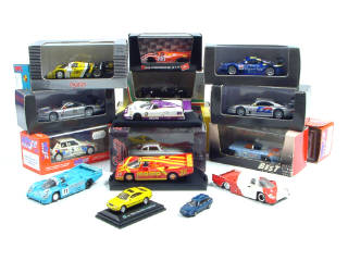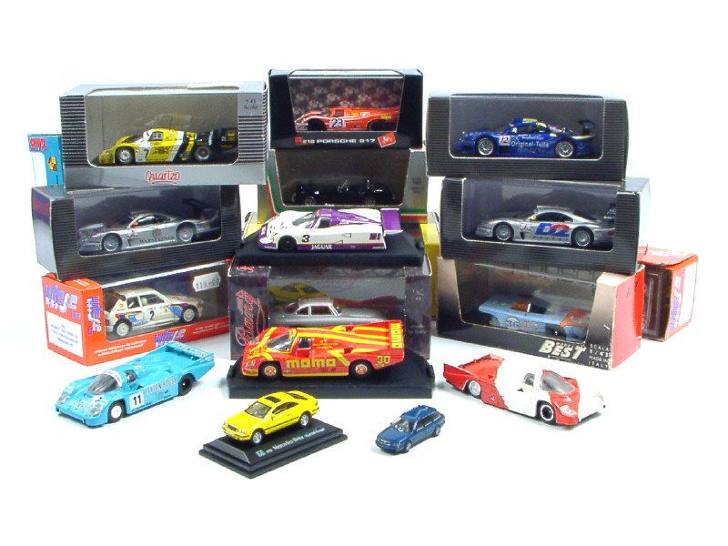 miniatures reproduisant les modèles : MERCEDES, AC, PORSCHE, PEUGEOT, JAGUAR & RENAULT - on y retrouve notamment les marques : UNIVERSAL HOBBIES, VITESSE, QUARTZO, BRUMM, ONYX, MODEL BEST, MODEL BOX & BANG - 5 boîtes en état 'c' & une en état 'd' - on y joint 2 modèles MERCEDES & AUDI à l'échelle 1/87ème
