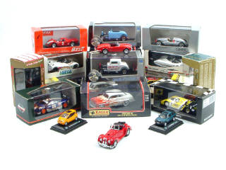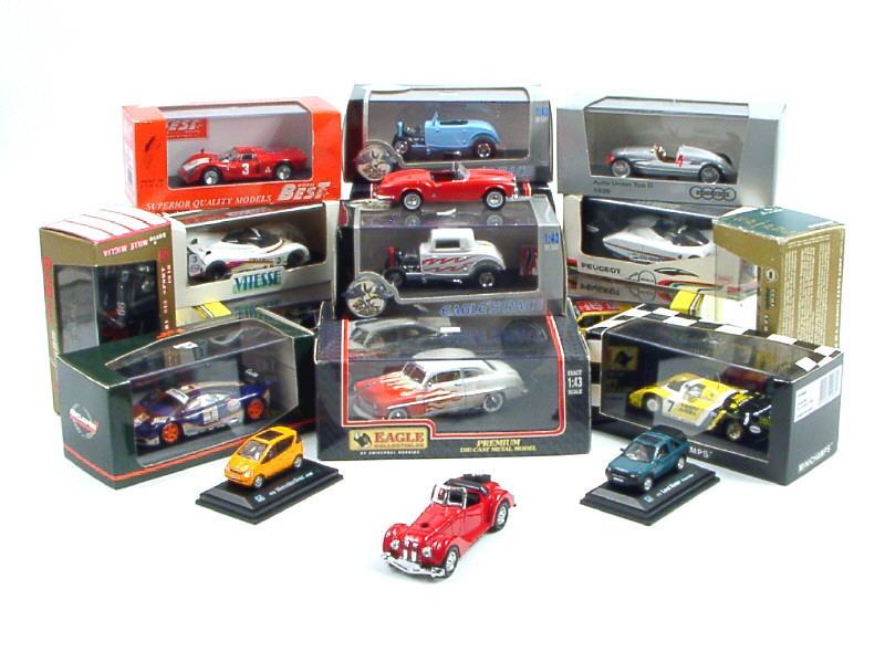 miniatures reproduisant les modèles : PORSCHE, RENAULT, LANCIA, PEUGEOT, Mc LAREN, AUTO-UNION, FERRARI, MERCURY, FORD, ALFA ROMEO & DODGE - on y retrouve notamment les marques : BRUMM, UNIVERSAL HOBBIES, VITESSE, MODEL BEST & MINICHAMPS - une boîte en état 'c' & une voiture-briquet (fonctionne) - on y joint une LAND ROVER & une MERCEDES à l'échelle 1/72ème