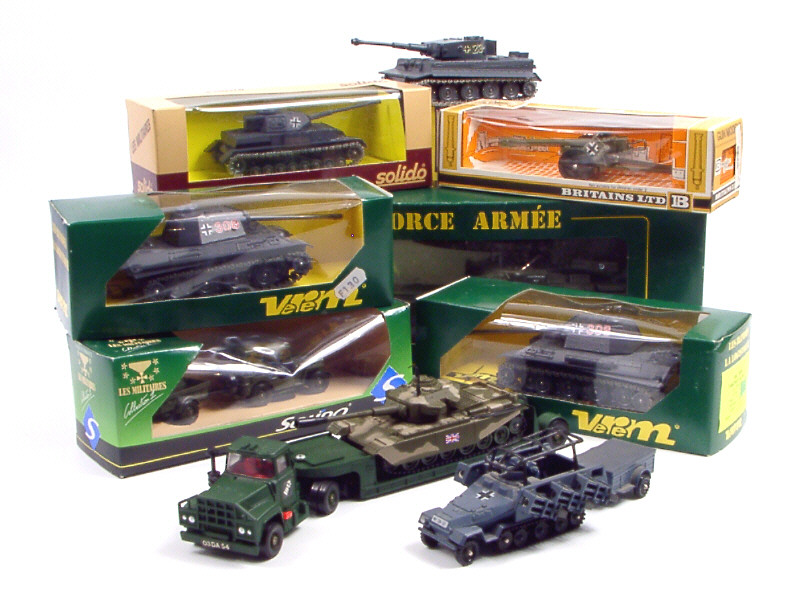 comprend : un BERLIET T12 avec char AMX 30 PLUTON, une JEEP avec remorque, un PANZER IV, un canon allemand, 2 PANTHER PZ KW5, un TIGRE, un MACK avec char CENTURION & un HANOMAG SDKFZ lance-roquettes avec remorque à munitions - on y retrouve les marques : SOLIDO, VEREM, BRITAINS & CORGI-TOYS - un modèle sans boîte en état 'B' avec une roquette cassée