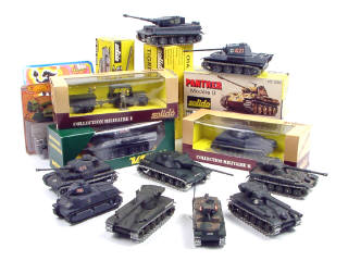 comprend : un PANTHER G, un TIGRE 1, un AMX 30T, un PANTHER PZ KW5, une jeep avec remorque, 2 PANZER IV, 2 chars SOMUA, 3 AMX 13T, un bulldozer, un camion-benne militaire & un canon en porte-clés - 6 modèles sans boîte avec petits manques - 3 modèles sous blister jamais déballés - on y retrouve les marques : SOLIDO, VEREM, MATCHBOX & BUCANERO