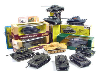 comprend : un PANTHER PZ KW5, un DESTROYER M10, 2 PANZER IV, un AMX 30T, 2 PANTHER G, un KAISER JEEP, un AMX BITUBE, un GENERAL PATTON, 2 AMX 30T, un bulldozer, un camion-benne militaire & un canon en porte-clefs - 6 modèles sans boîte avec petits manques - 3 modèles sous blister jamais déballés - on y retrouve les marques : SOLIDO, VEREM, MATCHBOX & BUCANERO