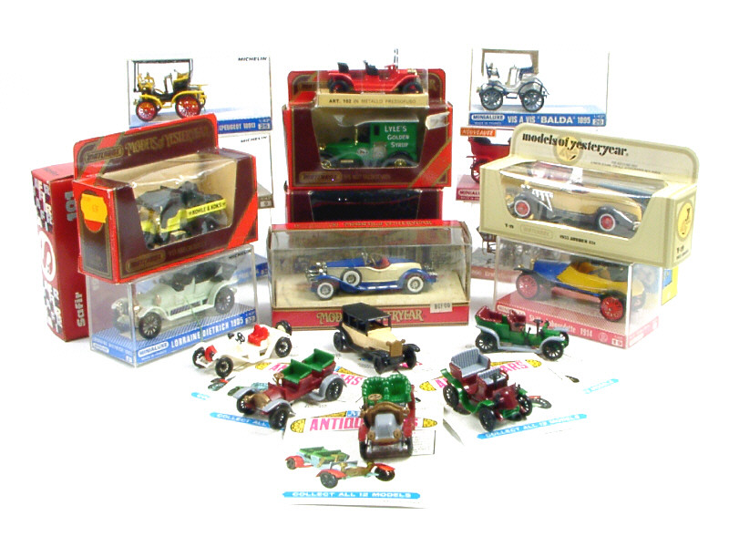 miniatures reproduisant les modèles : TALBOT, SIMPLEX, BALDA, PANHARD & LEVASSOR, GREGOIRE, TATRA, AUBURN, CROSSLEY, STUTZ, FORD, PEUGEOT, LORRAINE DIETRICH, LABOURDETTE, DAIMLER, GOBRON BRILLIE, LION-PEUGEOT, LANCIA, MERCER, MERCEDES & RENAULT - on y retrouve les marques : MINI ANTIQUE CARS, MATCHBOX MODELS OF YESTERYEAR, MINIALUXE, CURSOR, SAFIR, IGRA & OLD CARS - 6 modèles avec notices cartonnées d'assemblage - un modèle avec axe de roue oxydé
