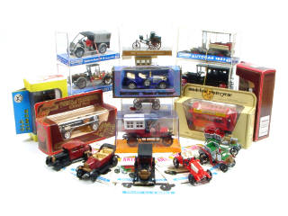 miniatures reproduisant les modèles : E.R.A, TATRA, JAMIESON, OLDSMOBILE, A.E.C, UNIC, VAUXHALL, ADLER, BENZ, PANHARD & LEVASSOR, DE DION-BOUTON, MERCEDES, VOISIN, FIAT, ROCHER SCHNEIDER, CITROËN & RENAULT - on y retrouve les marques : MINIALUXE, CURSOR, MINI ANTIQUE CARS, MATCHBOX MODELS OF YESTERYEAR, IGRA & ZISS-MODELL - 6 modèles avec notices cartonnées d'assemblage