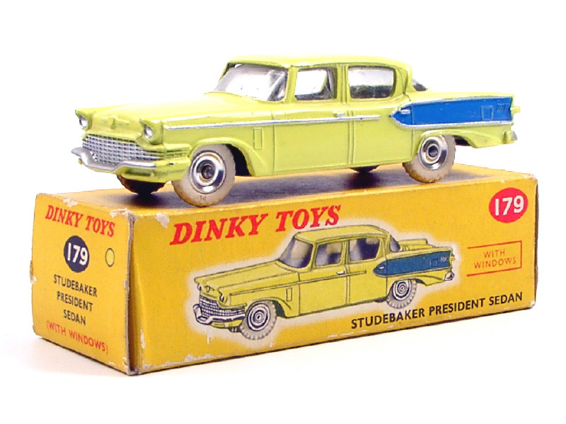 DINKY TOYS (GB) 179 STUDEBAKER PRESIDENT Sedan jaune citron & filets bleus, jantes aluminium