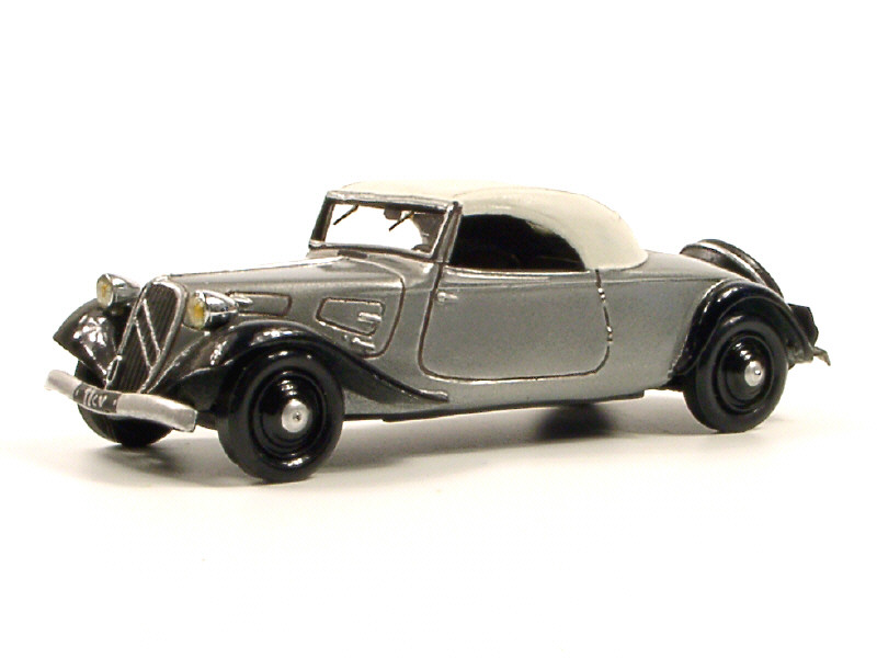 DEVOS (FRANCE) J1 CITROËN 11CV Cabriolet large capoté 1936 gris argent, ailes noires & capote blanche