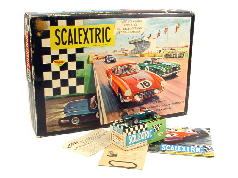 dimensions du coffret : 56 x 38 cm - contient : des rails, des éléments de piste, 4 notices & un catalogue - coffret incomplet