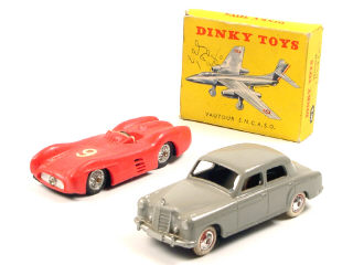 on y joint une MERCEDES de compétition en état 'D' de la marque NOREV avec saute-vent manquant & une boîte vide de la référence 60B de la marque DINKY TOYS en état 'b' avec petites annotations - we include a MERCEDES race car, made by NOREV, in 'D' condition, missing its windscreen & an empty DINKY TOYS box, reference 60B, in 'b' condition with small markings